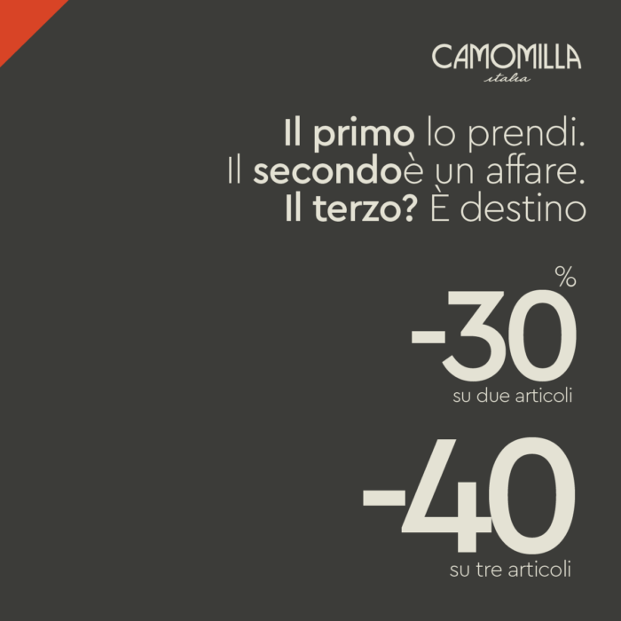 Da Camomilla Italia più acquisti, più sconti! Con 2 articoli hai il 30% di sconto, con 3 articoli il 40%.